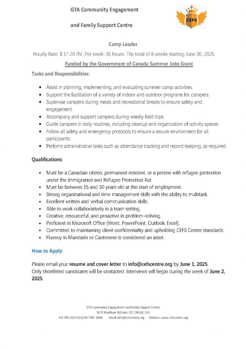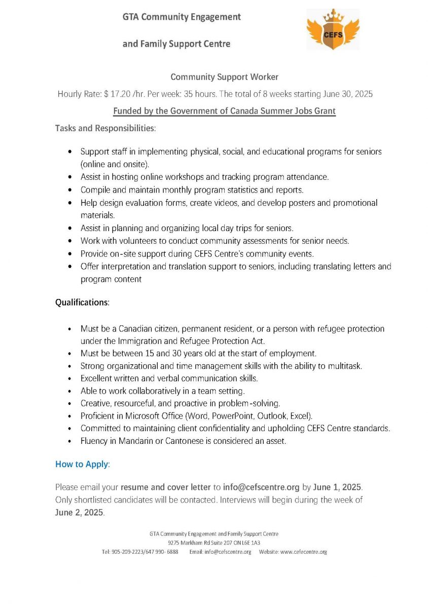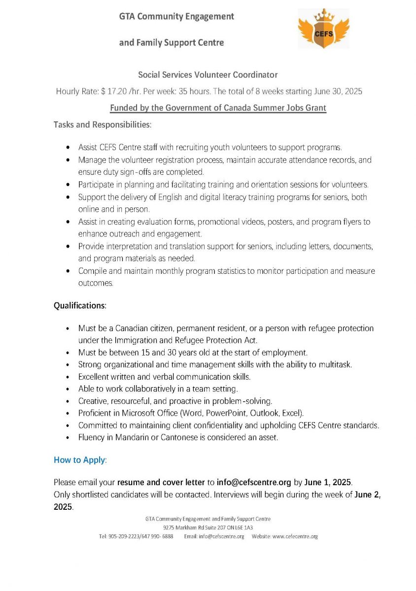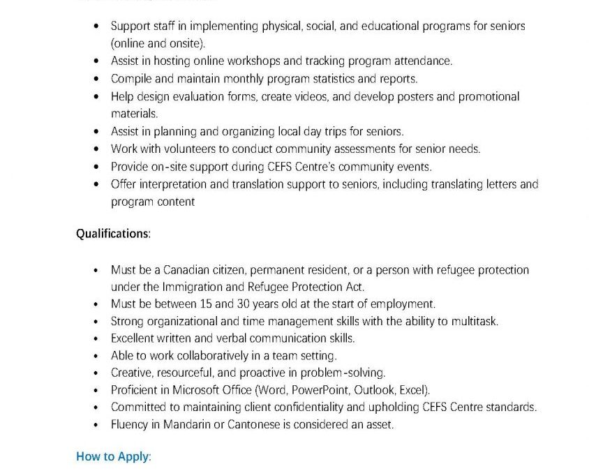 CEFS Centre is currently hiring 5 summer positions for youth. We welcome enthusiastic young individuals who are passionate about community service to apply!