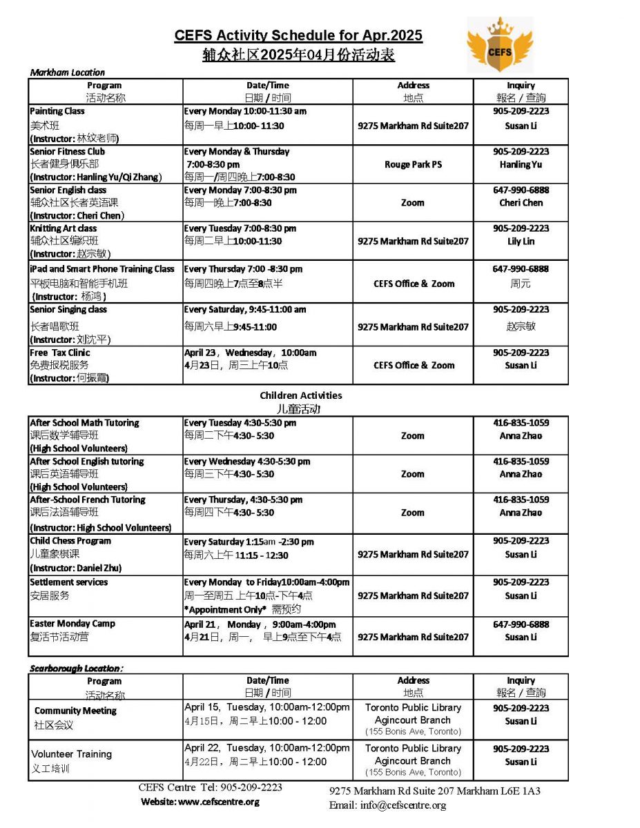 四月活动表 Mar 31, 2025 | Community News, Community Services, Family Services, Latest Events, News, Services, Settlement Services
